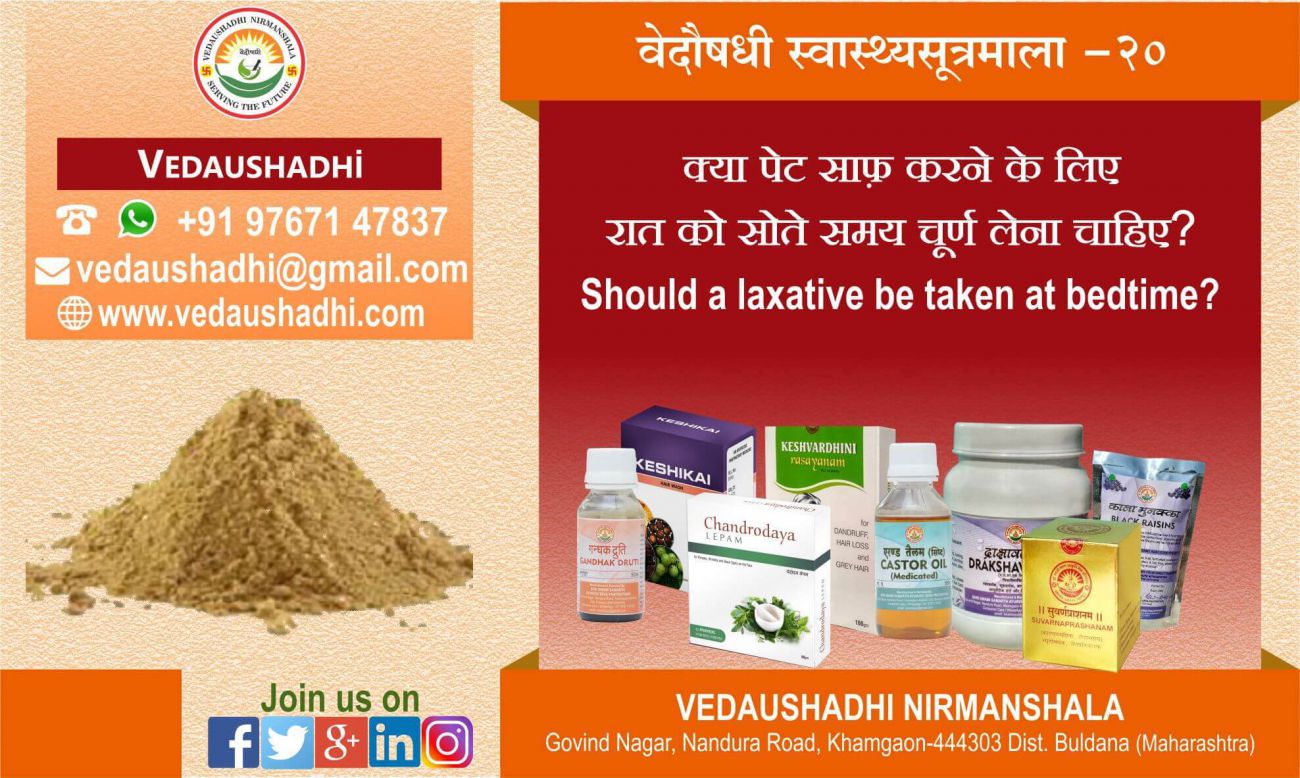 सभी लोग पेट साफ करने के लिए ली जानेवाली औषधी रात को सोते समय लेते है। परंतु आयुर्वेद मे तो ऐसा कही लिखा नही है। इसमे शोकांतिका यह है ज्यादातर वैद्य भी पेट साफ करने की औषधी लेने का निर्देश रात्री मे सोने से पहले ही देते है, जिससे यह गलत संकल्पना भी जनमानस मे दृढ हो गई की पेट साफ करने की औषधी रात को सोते समय ही लेनी चाहिए।