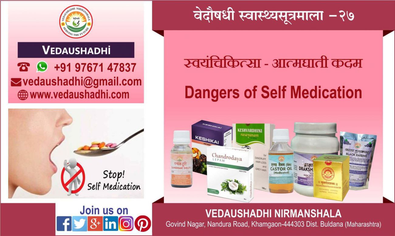 अतः एव छोटे से छोटे व्याधी मे भी स्वयंचिकित्सा करना उचित नही है। स्वयंचिकित्सा से रोगी की जान भी जा सकती है। इसीलिए स्वयंचिकित्सा से बचे एवं तज्ञ डॉक्टर की सलाह लेकर अपने आप को सुखी एवं सुरक्षित करे।