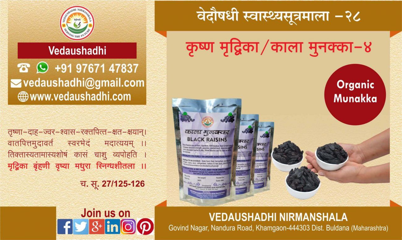 मृद्विका अर्थात मुनक्का। बाजार मे आजकल दो प्रकार के मुनक्का उपलब्ध है। पीले और काले। दोनो के गुणधर्म एक समान ही होते है। फिर भी काला मुनक्का पीले मुनक्के से श्रेष्ठ माना जाता है। क्यों कि काले मुनक्के मे सभी प्राकृतिक गुणधर्मों का प्रकर्ष देखने को मिलता है। यही काला मुनक्का अगर सेन्द्रिय (organic) हो तो क्या कहने!! स्वामीआयुर्वेद काला मुनक्का ऐसा ही एक सेन्द्रिय उत्पाद है। इसीलिए अपने प्राकृतिक गुणों से परिपूर्ण है।