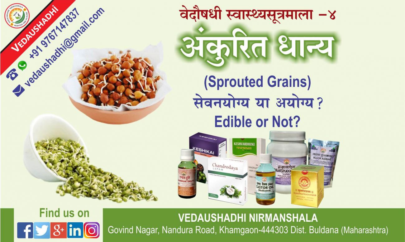 तो इन तीनो प्रश्नों में आपके प्रश्न का भी उत्तर छुपा हुआ है। अर्थात कोई सेंद्रिय असात्म्य आहार (incompatible diet) लेने के बाद शरीर तुरंत प्रतिक्रिया नही बनाता। जब तक वह असात्म्य आहार एक निश्चित मारक स्तर तक नही पहुँचता, तब तक वो भी अपने शरीर को हानी नहीं पहुँचाता। इसे ही आयुर्वेद दूषीविष अर्थात slow poison कहता है। अंकुरित धान्याहार भी इसी श्रेणी (Category) के अंतर्गत ही आता है। आप समाज में एक छोटासा सर्वे (survey) कीजिये। अंकुरित धान्य के जैसा तथाकथित हेल्दी फ़ूड (Healthy food) लेने वाले सज्जनों का सर्वे कीजिये। इनमेंसे ज्यादातर लोगों में बीपी, डायबिटीज़, सफ़ेद दाग़, अचानक बाल झड़ना, नजर कमजोर होना, अचानक पुरे शरीर में खुजली शुरू होना, कम आयु में ही अधेड़ उम्र का नजर आना, वारंवार विस्मरण होना (आज जिसे देखा, एक हफ्ते के बाद उसे ही न पहचानना) इस तरह की समस्याएं मिलेगी। इन सब सज्जनो के पैथोलॉजी रिपोर्ट्स सामान्य ही आते है, फिर भी उपरोक्त विकृतिया तो इनमे मिलती ही है। इसका मतलब पैथोलॉजी मशीन उस कारण को ढूँढने में असमर्थ है, जिसकी वजह से ये समस्याएं उत्पन्न हो रही है। तो वो कौनसे कारण हो सकते है, जिन्हें पैथोलॉजी मशीन ढ़ूँढ नही पाती? इसका उत्तर बहोत ही सीधा सीधा है - अंकुरित धान्य जैसे ग्राम्य आहार। इसलिए अपने प्राचीन ऋषि-मुनियो के शास्त्रवचनों पर विश्वास रखिये और ऐसे ग्राम्य आहार का त्याग करे। यही सदैव स्वस्थ बने रहने की चाबी है।