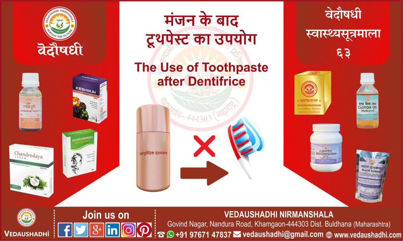 सुबह नींद से जागने के बाद मुखशुद्धि के लिए सभी भारतीय प्राचीन काल से मंजन का उपयोग किया करते थे। परंतु ब्रिटिश आये और हमारी दिनचर्या और पूर्ण जीवनशैली ही बदल गई। मंजन की जगह हम लोग टूथपेस्ट का उपयोग करने लगे और टूथपेस्ट का उपयोग कर अपने आप को आधुनिक समझने लगे। टूथपेस्ट के उपयोग का परिणाम यह निकला की पहले सिर्......